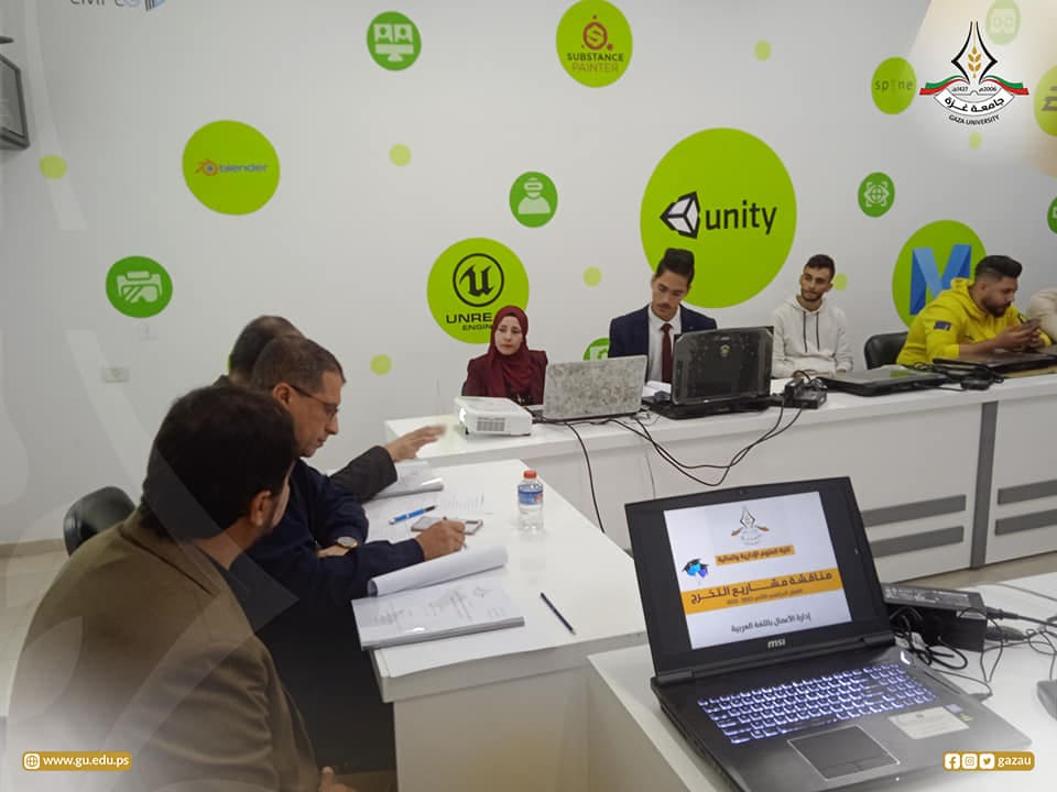 The graduation projects of business administration and accounting students registered for the course were discussed in the second semester of the academic year 2022-2023. The discussion committees in the main branch in Gaza consisted of Dr. Tariq Abu Hjayyer and Dr. Firas Shehadeh, supervisors of graduation projects, Dr. Hassan Abu Nasser, Dr. Nael Musabeh. And Dr. Salem Al-Amour. In the North Branch, the committee consisted of Dr. Muhammad Al-Za’noun, project supervisor, Dr. Ali Abu Jarad, and Dr. Nabil Al-Louh. The committees praised the level of students’ projects and their clear efforts in completing the projects.