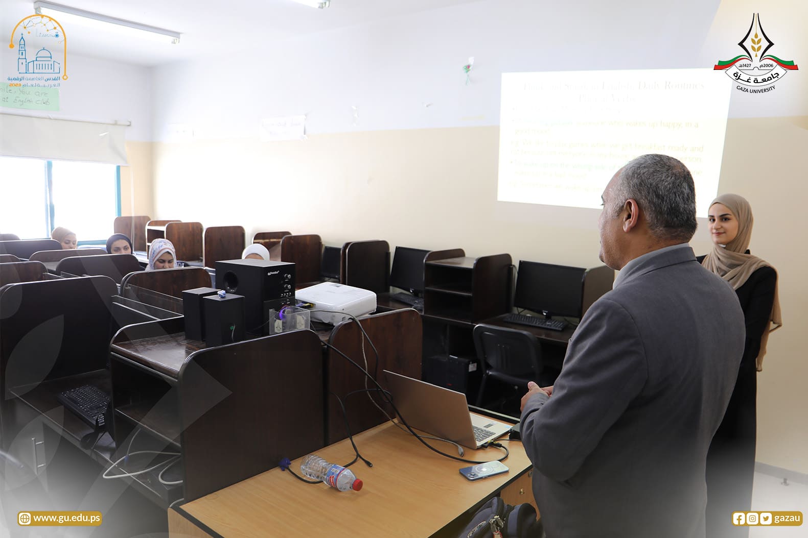 وبدأت المدربة ملك الحو بعرض المحاضرة وتدريب الطلبة بالتعريف عن أنفسهم باللغة الإنجليزية بطريقة رسمية، والتركيز على بعض الأمثال والمصطلحات الأكثر استخداماً في اللغة.
